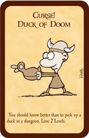 If there is no monster, you also have the options of looting the room (draw an extra adventure card which you keep in your hand), or looking for trouble (play a monster from your hand to fight and defeat). Hence, it can be advantageous to keep weaker monsters in your hand, like the Angry Duck, to play against yourself, as they still let you level up.